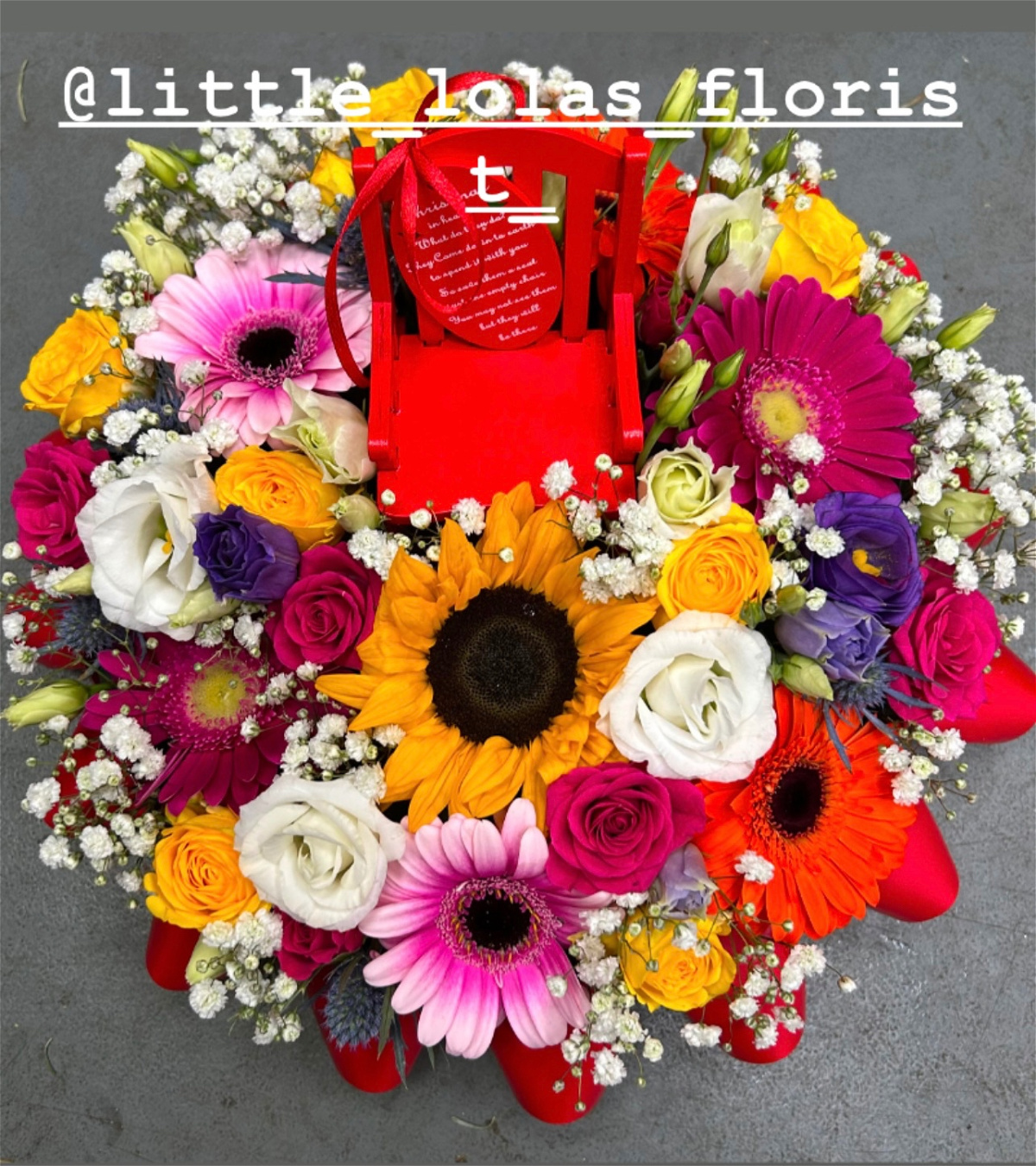 Traditional white base with seasonal flowers, complete with Red rocking chair.